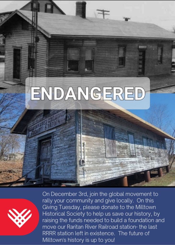 On Giving Tuesday, we humbly ask for your support in our quest to save Milltown’s history, by donating on the “Save Our Station” page. Your generous donation will help us build a sturdy foundation for the Raritan River Railroad station, in preparation for its move. Any amount helps in our efforts to save this bit of Milltown history, that nobody wants to see destroyed. The owner of the property where the station currently sits, has been very patient and very supportive of our efforts- and we are beyond grateful for that! However, after giving us so much time, he has finally decided to move ahead with his plans for the area where the station currently sits, so now, time is of the essence!