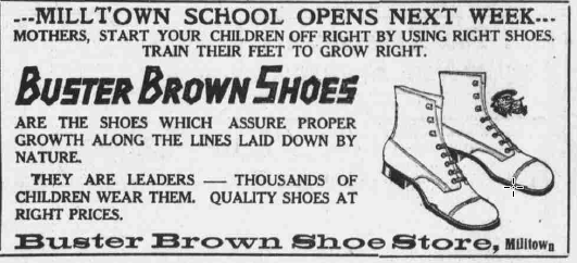 MILLTOWN, May 3-The Buster Brown shoe store, which in the past two years has given Milltown one of the best shoe centers in this locality, in celebrating its second anniversary this week and is enabling the boroughites to take part in it by announcing a tremendous cut In prices for this occasion on all merchandise.